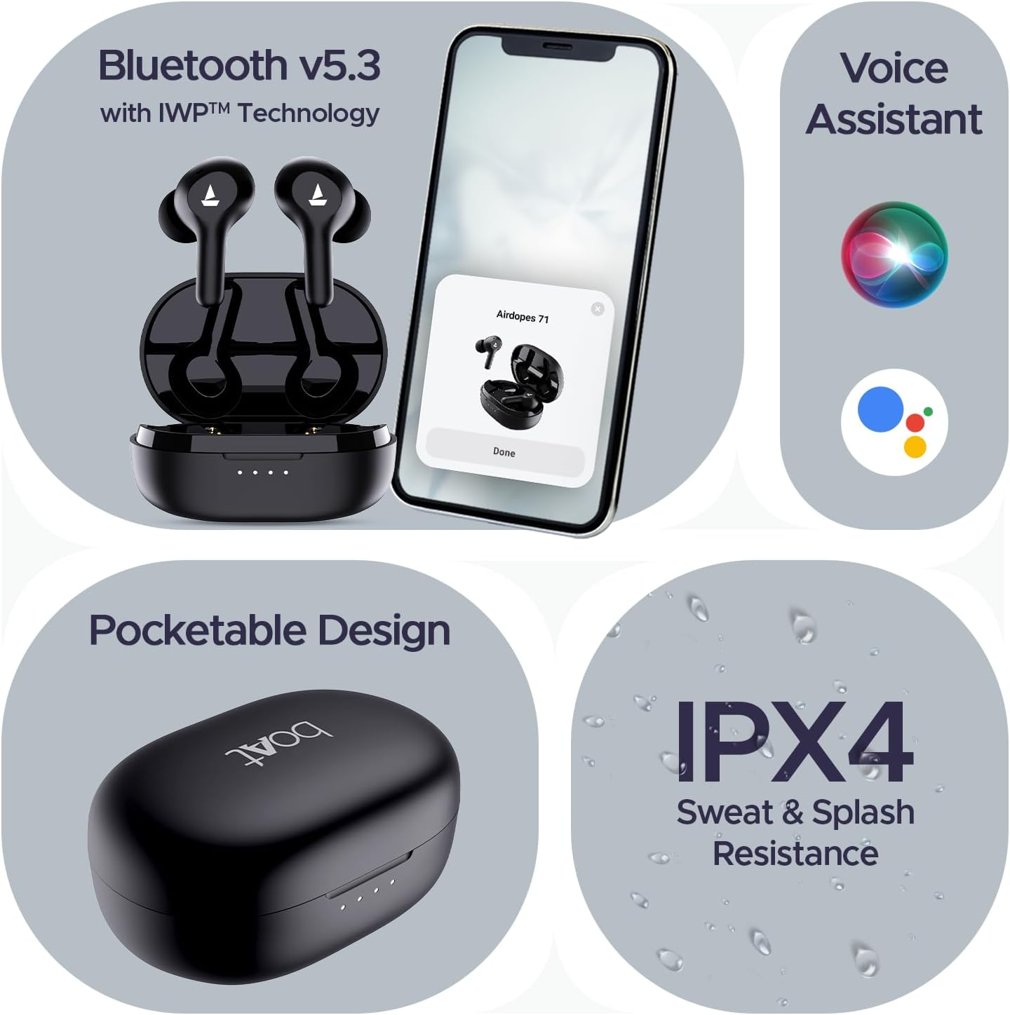 - IPX4 Splash Resistance: Show off your Airdopes without worrying about damage! IPX4 rating keeps sweat and water splashes away for matchless grooving at the gym, poolside, beaches, etc.