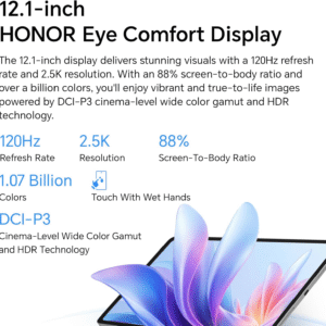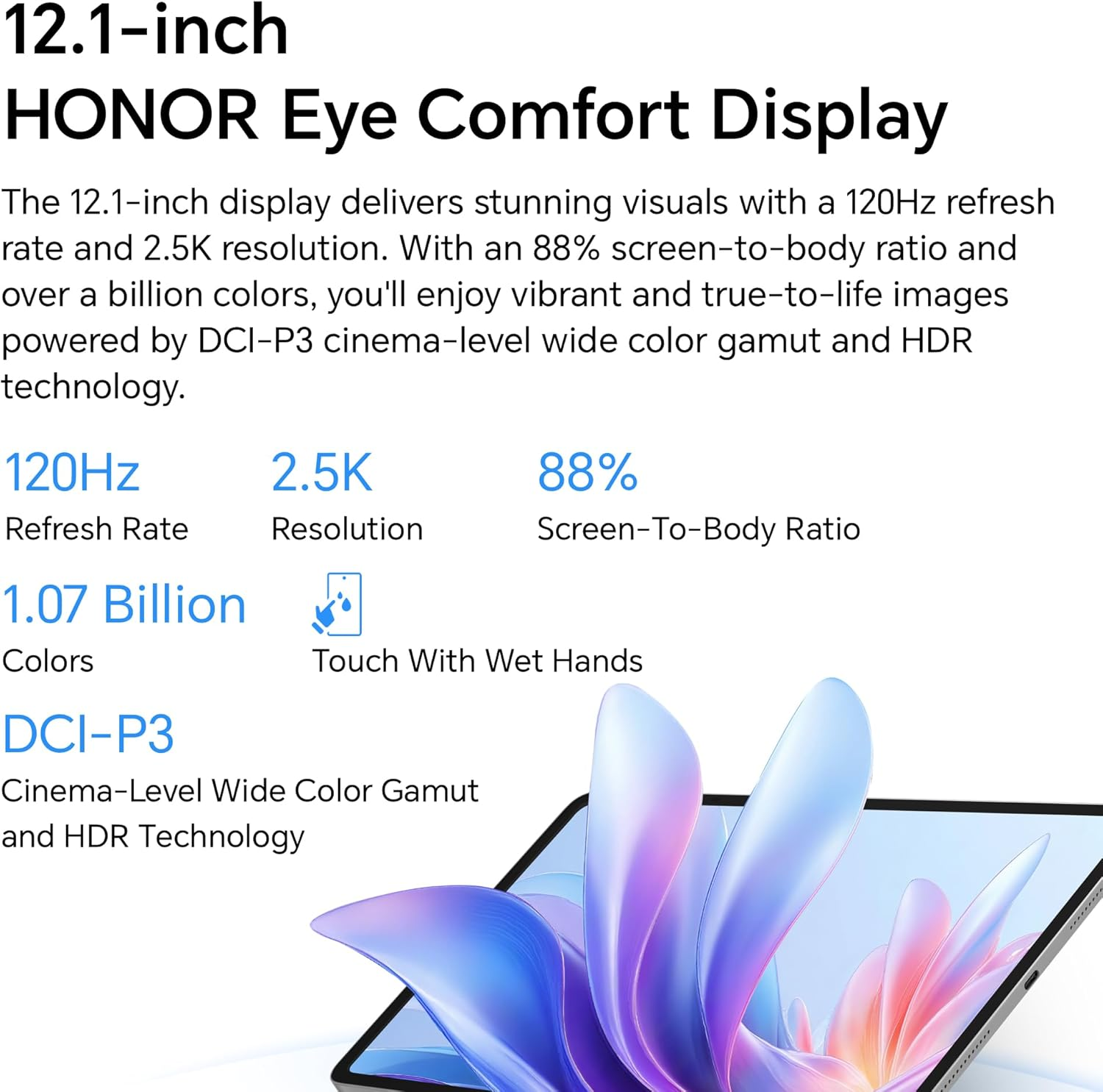 - [12.1″ 2.5K HONOR EYE COMFORT DISPLAY] – Large immersive screen with HDR, 120Hz refresh rate, and TÜV Rheinland low blue light certification — perfect for reading, streaming, or working long hours.