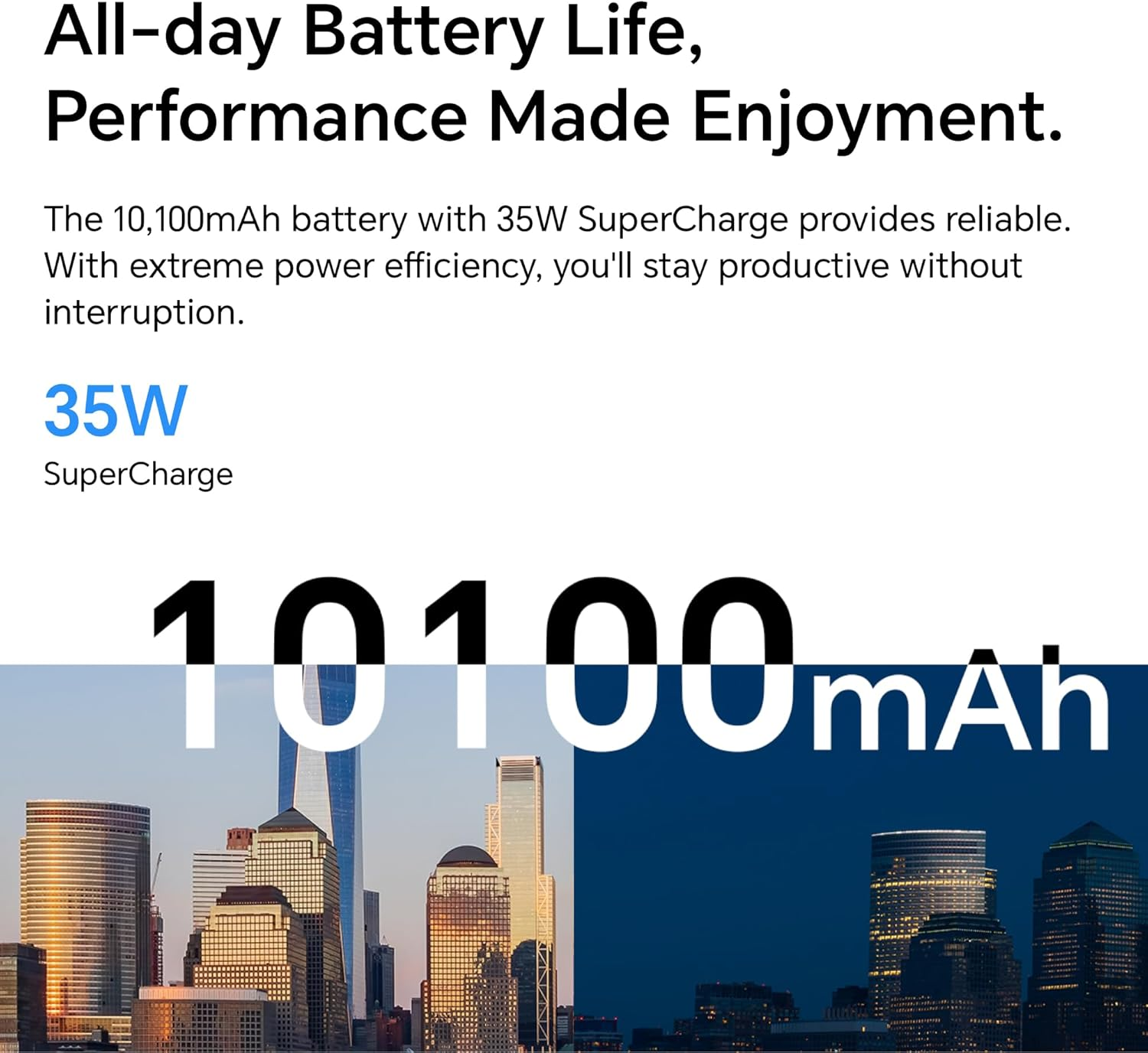 - [MASSIVE 10100MAH BATTERY + 35W FAST CHARGING] – All-day usage powered by a long-lasting battery and fast USB Type-C charging — ideal for travel, study, or hybrid work.